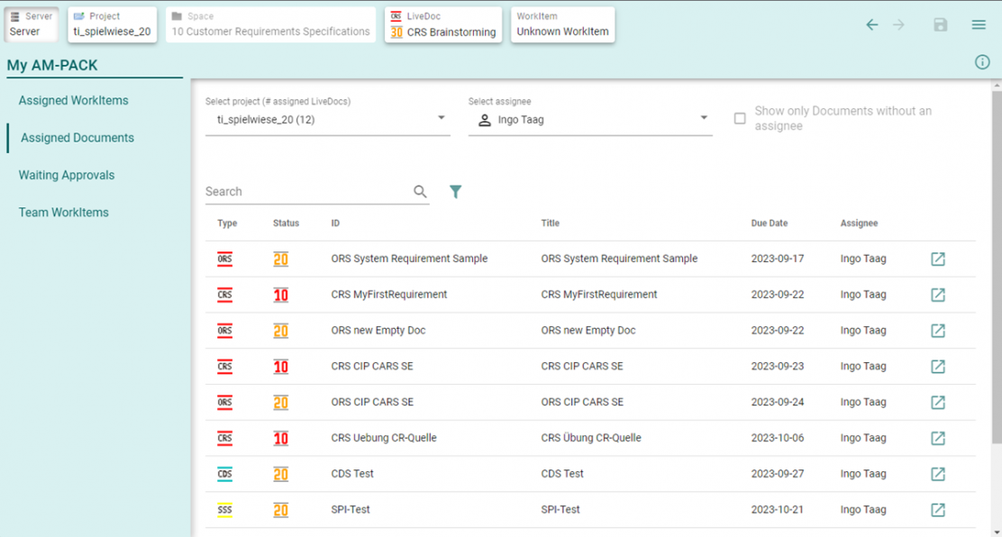 Optimieren Sie Ihre Arbeitsweise: Mit dem AM-PACK Control-Window können Sie mühelos durch alle Livedocs eines Projekts navigieren und Workitems nach Status und Typ filtern. So gewinnen Sie Zeit für strategische Aufgaben und steigern die Produktivität im Team.